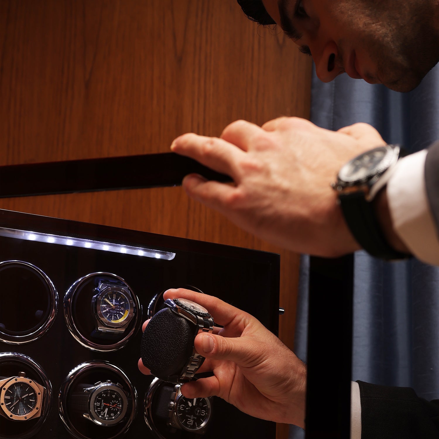 - Elegant Presentation: Features LED touchscreen interior lighting, custom watch dial, and a clear glass window.